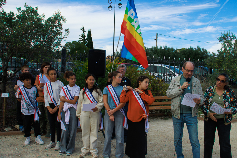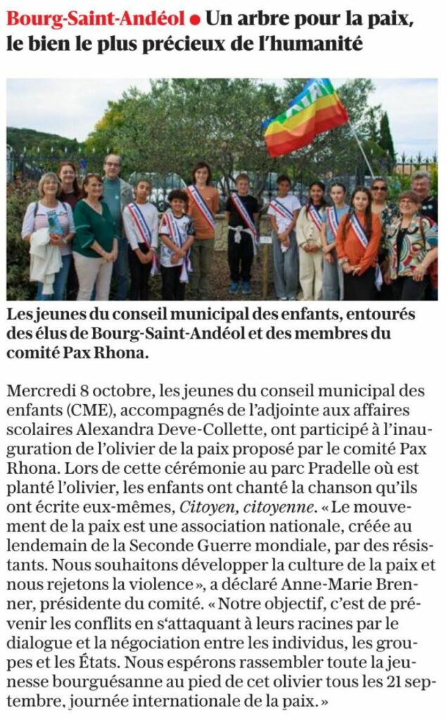Le comité du Mouvement de la Paix est très heureux et remercie Madame la maire, le conseil municipal de Bourg Saint Andéol, ainsi que le conseil municipal des enfants d’avoir permis et organisé aujourd’hui l’inauguration de cet olivier, arbre et symbole de la Paix.