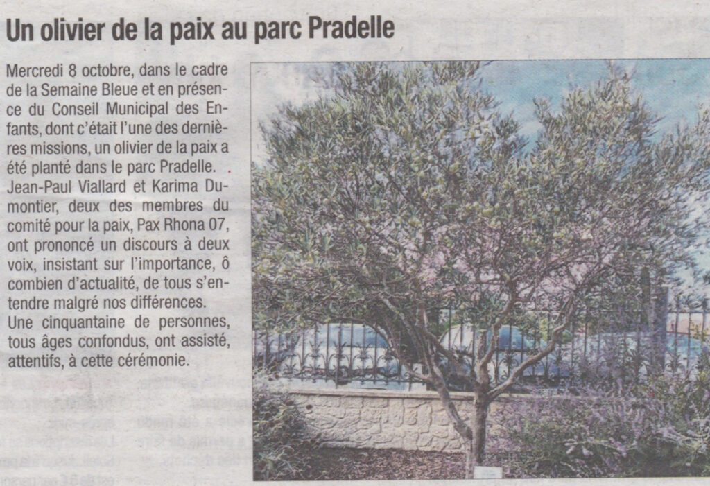 Au nom du Mouvement de la Paix nous souhaitons que, pour la Journée Internationale de la Paix, cet olivier voit se réunir autour de lui chaque 21 septembre tous les enfants, les adolescents et les grandes personnes qui garderont l’esprit critique et l’esprit de résistance pour que vive la voix de la liberté et du bonheur de vivre en Paix.